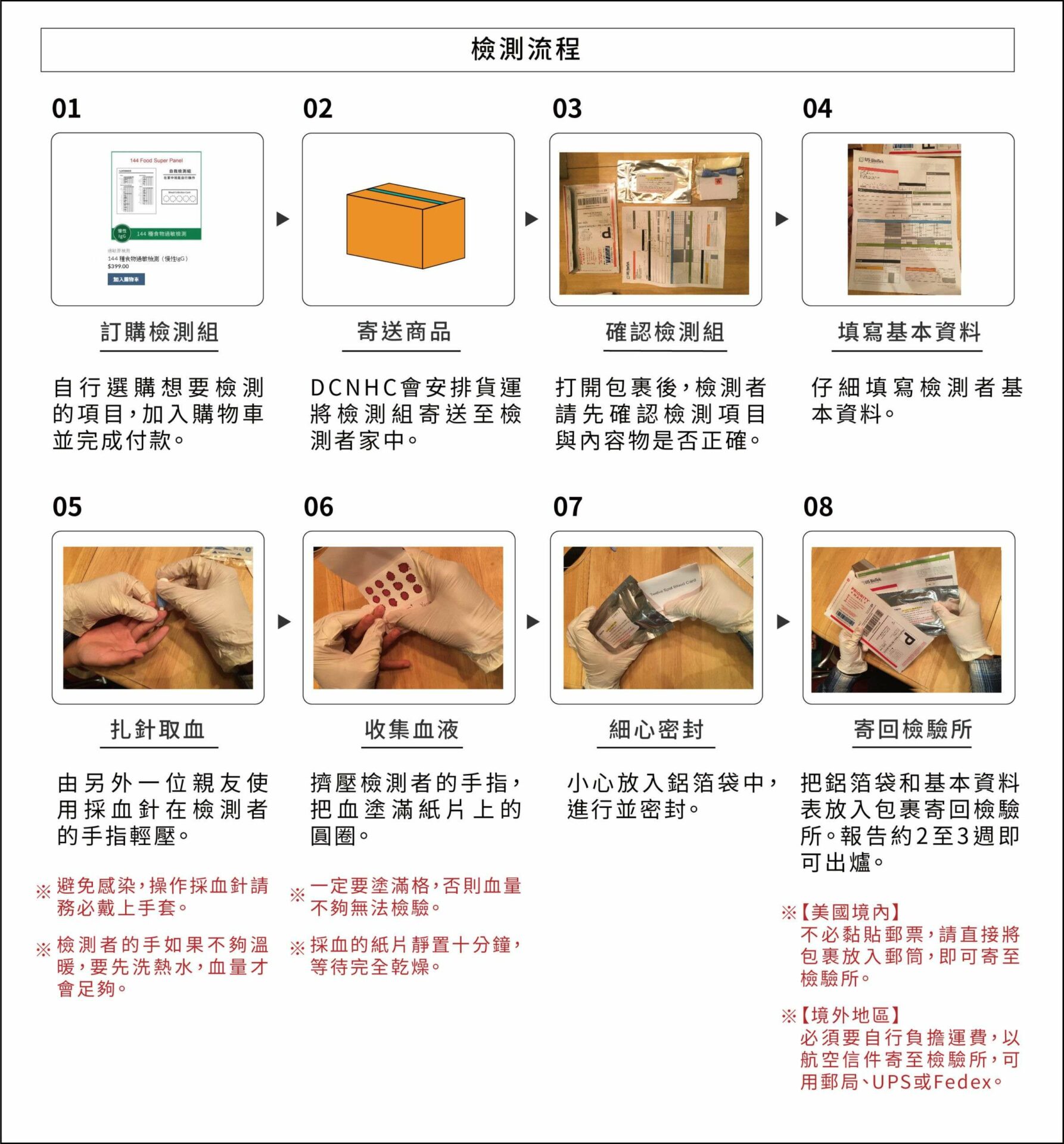 內附回郵信封只含美國境內郵資,非美國客戶需自付國際郵資寄回美國檢驗所。